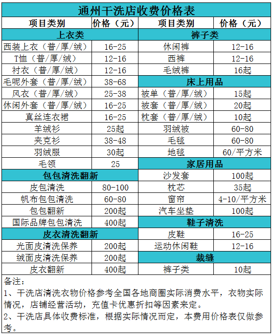通州干洗店收費價格表【詳細收費標準】怎么收費更賺錢