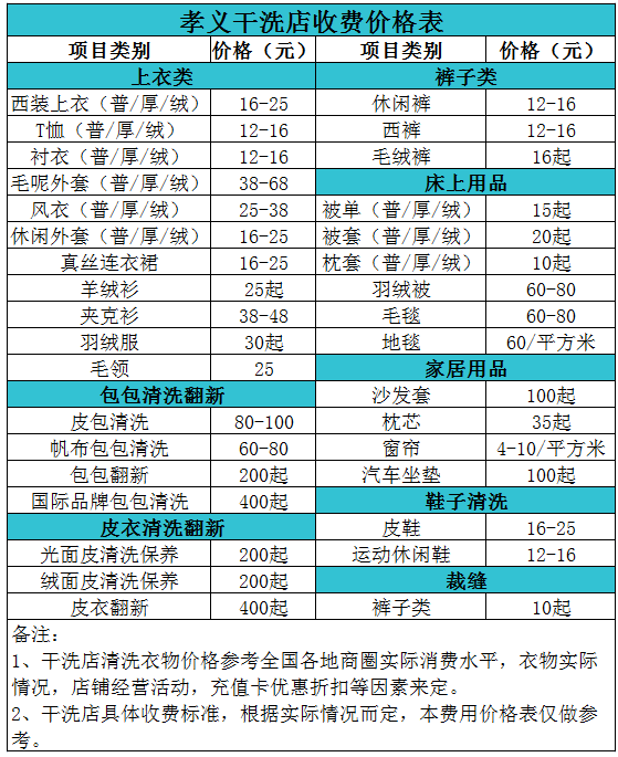 孝義干洗店收費價格表【詳細收費標準】怎么收費更賺錢